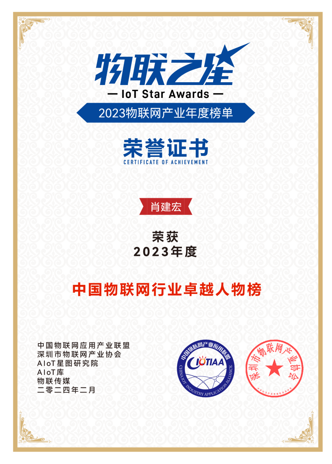 2023物联之星评选重磅出炉,肖建宏入选中国物联网行业卓越人物榜,芯翼信息荣获物联网企业投资价值50强
